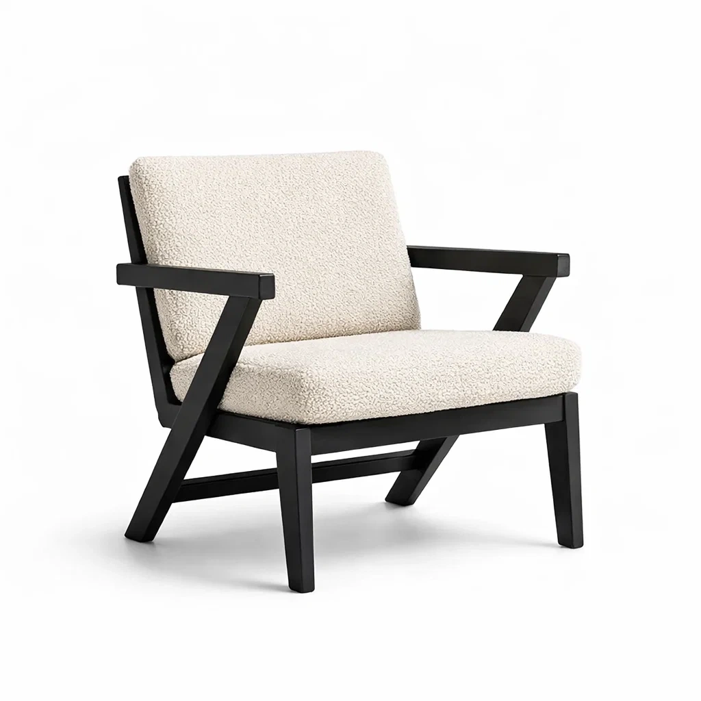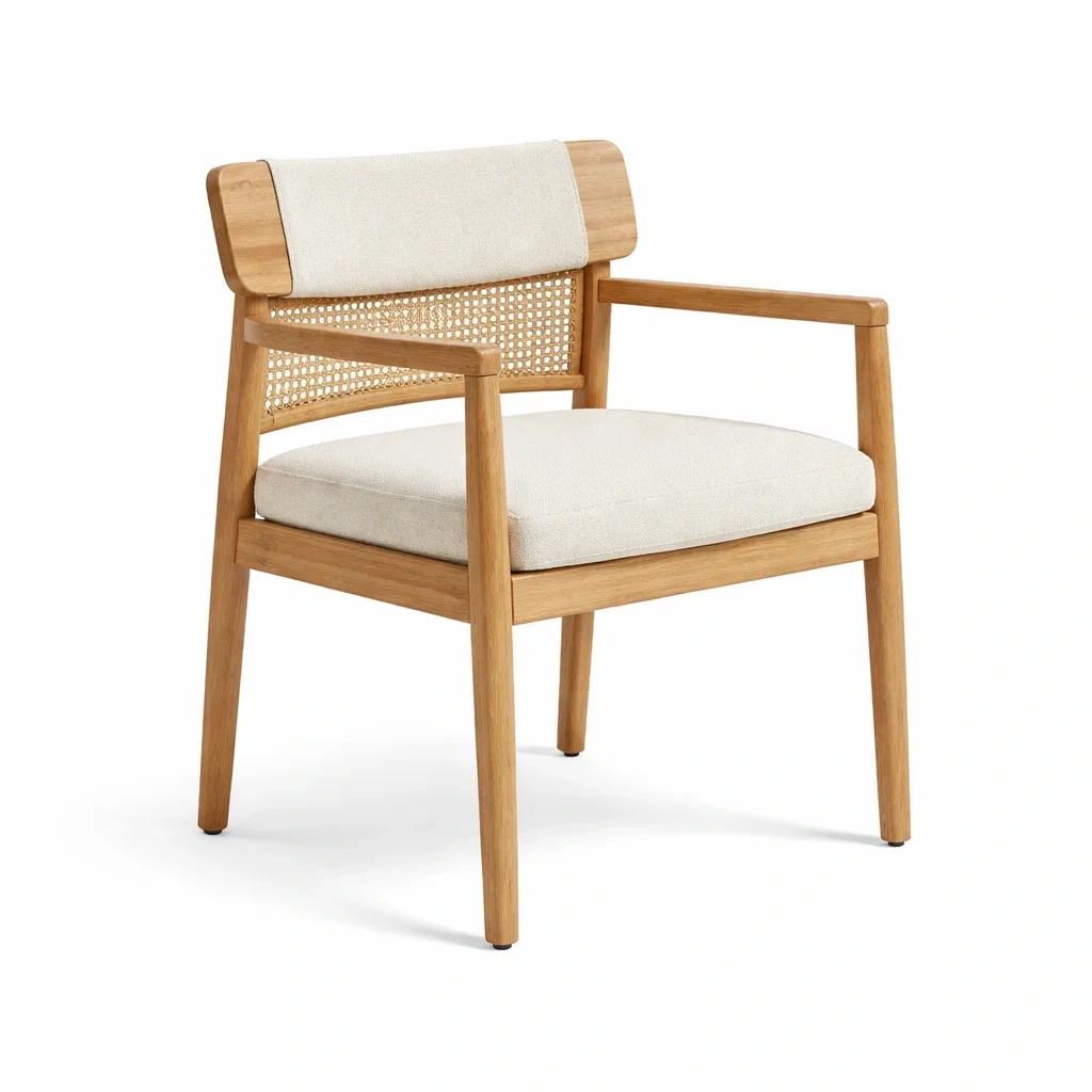 Poltrona in legno con seduta in tessuto beige e schienale in rattan