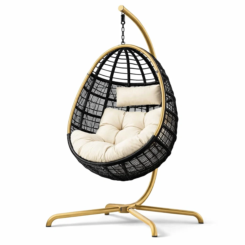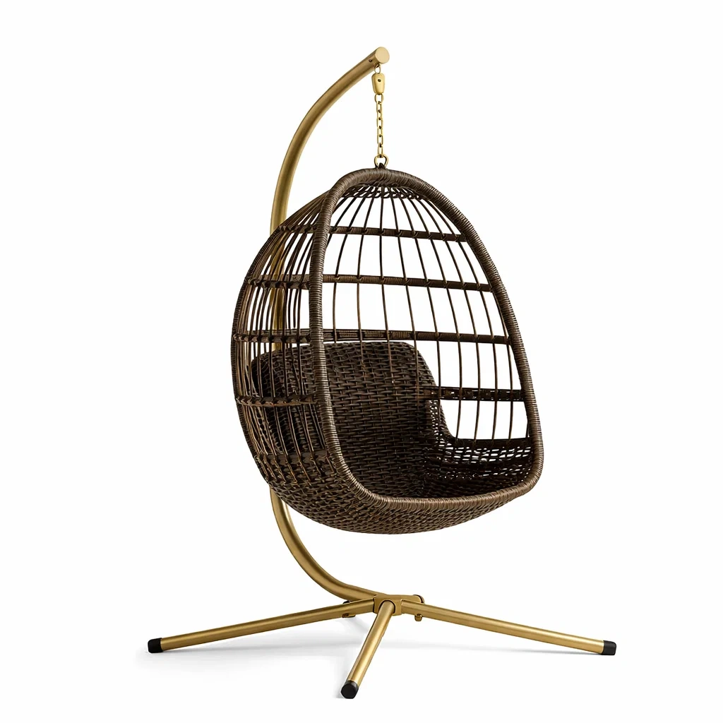 Poltrona sospesa a uovo in rattan sintetico con struttura in acciaio oro