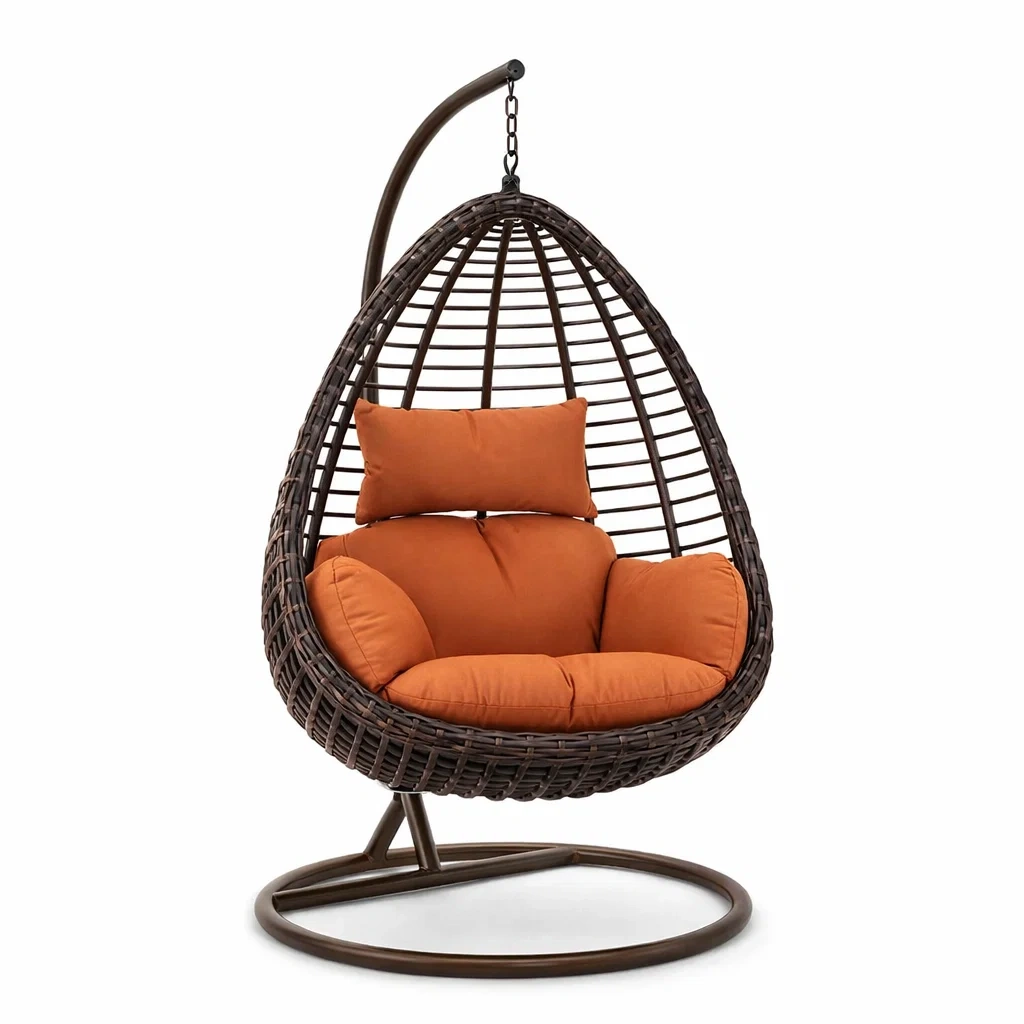 Poltrona sospesa a uovo in rattan sintetico marrone con cuscini arancioni