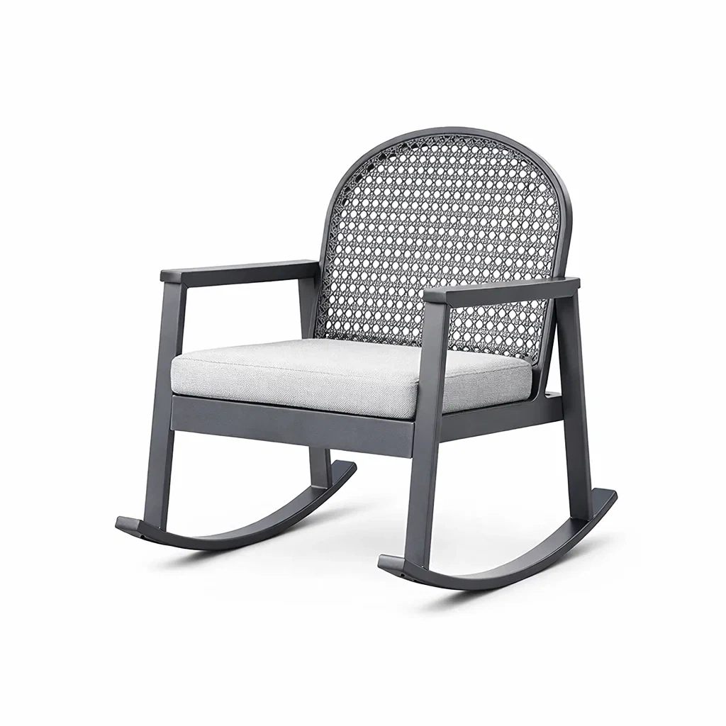 Sedia a dondolo in alluminio con rattan grigio e cuscini in poliestere