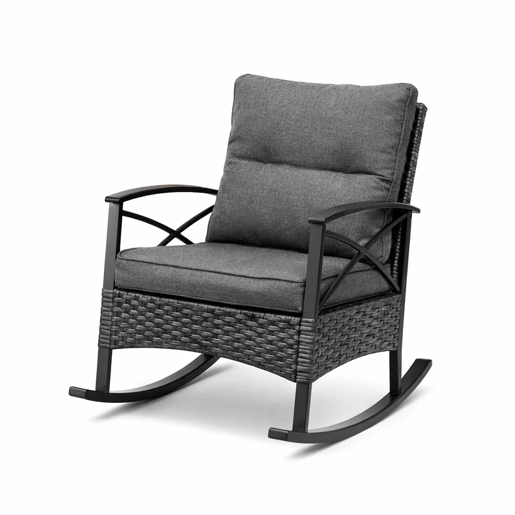 Sedia a dondolo in rattan sintetico grigio con cuscino