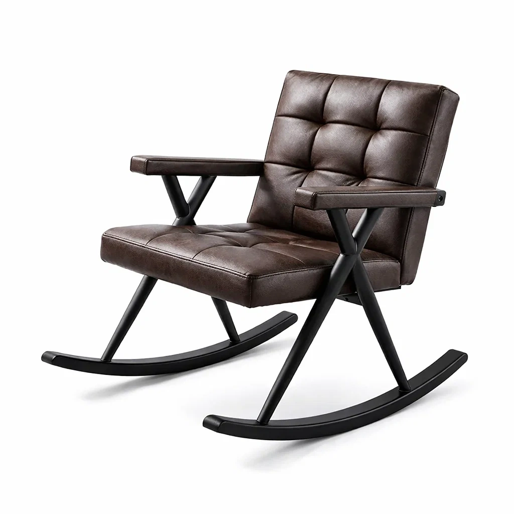 Sedia a dondolo in pelle sintetica marrone e metallo