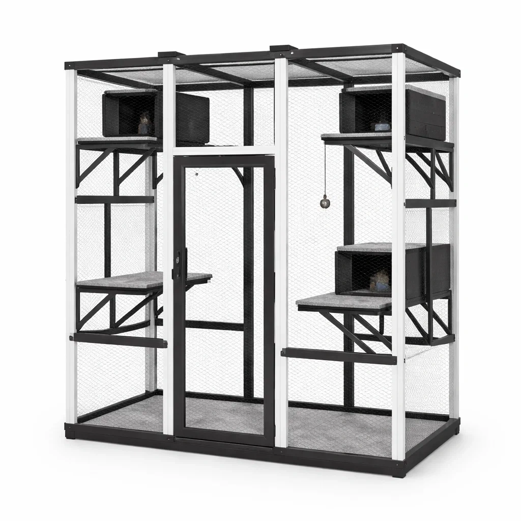 La struttura è di colore Nero e Bianco. Include piattaforme e ripiani per il comfort degli animali e garantisce un'area sicura per i gatti.