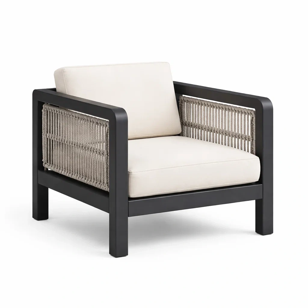 Materiale: Struttura in alluminio, seduta e schienale rivestiti in corda sintetica, cuscini imbottiti in schiuma ad alta densità con rivestimento in poliestere.