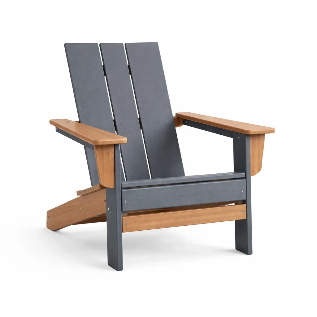 Questa sedia Adirondack è realizzata in composito di legno per la struttura principale e legno massello per i braccioli. Presenta una combinazione di colori grigio e naturale, con una lunghezza di 88 cm, una larghezza di 76 cm e un'altezza di 92 cm. La sedia offre una seduta ampia e un design robusto, progettata per l'uso esterno. Capacità di carico non specificata.