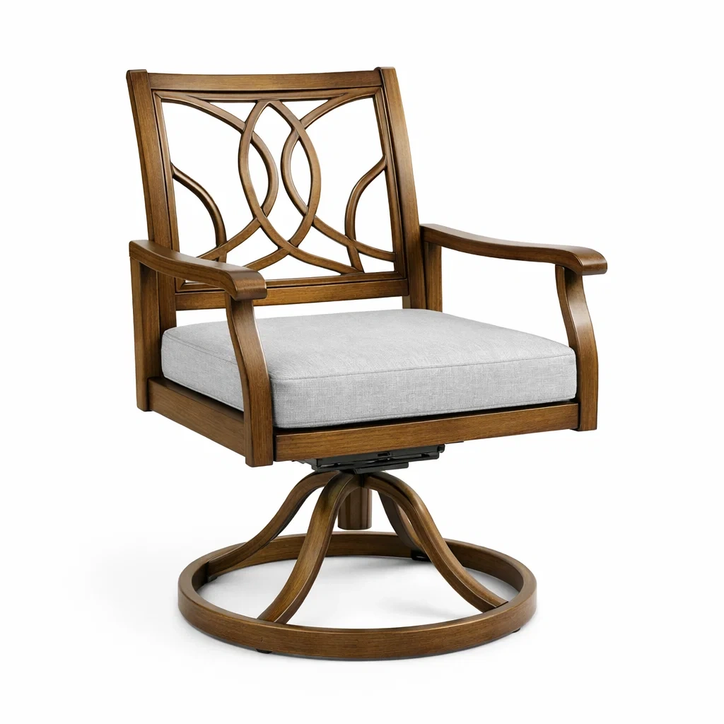 La sedia presenta una struttura in legno con schienale decorato e base girevole in metallo resistente. Il cuscino è rivestito in tessuto grigio e imbottito con schiuma di poliuretano.