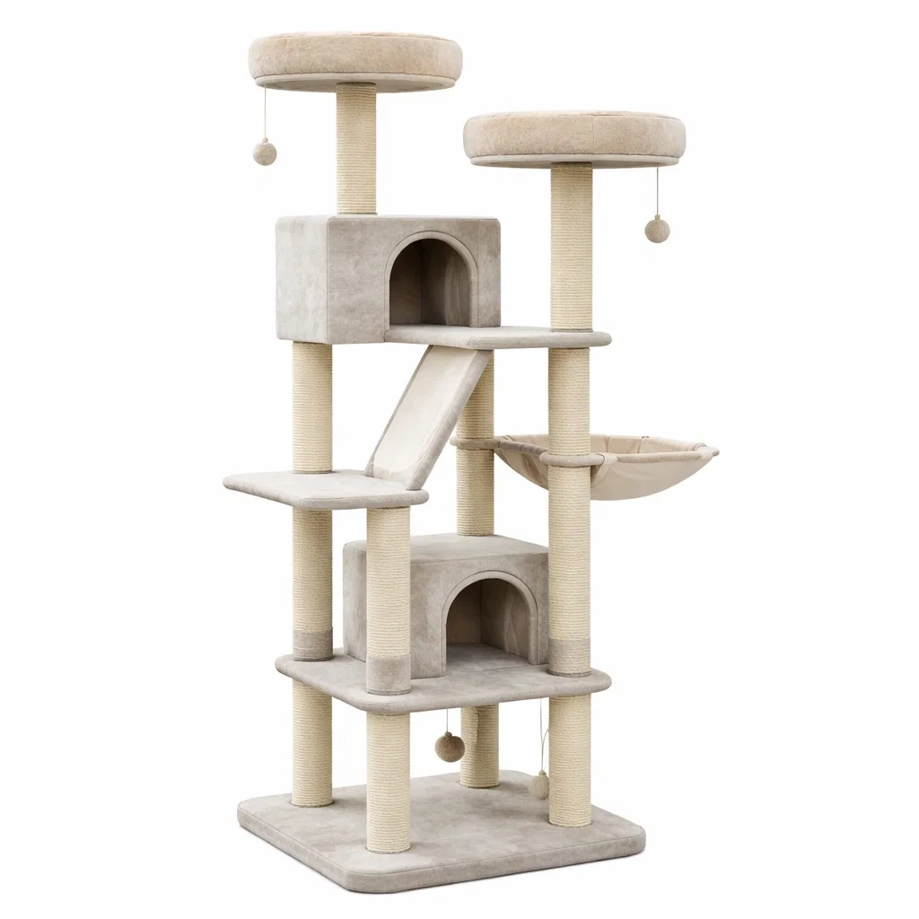 Il tiragraffi per gatti include piattaforme coperte di morbido tessuto in peluche, ideali per il riposo. Le colonne sono avvolte con corda di sisal per il graffio. La struttura è in MDF con rivestimento in peluche. Include un cestino sospeso e giocattoli pendenti.